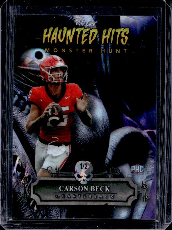 The Carson Beck 2024 Wild Card Haunted Hits #HHF-CB Haunted Hits Frankenstein 1 4 Crystal Holo Purple /2 card is 1 of 313 Carson Beck's card variations in the 2024 Wild Card Haunted Hits set being tracked by Sports Card Investor, including Haunted Hits Dracula 1 4 Rainbow Orange /5, Haunted Hits Frankenstein 1 4 Rainbow Orange /5, Haunted Hits House Rainbow Orange /5, Haunted Hits Pumpkin 1 4 Rainbow Orange /5, and Haunted Hits Scarecrow Rainbow Orange /5.