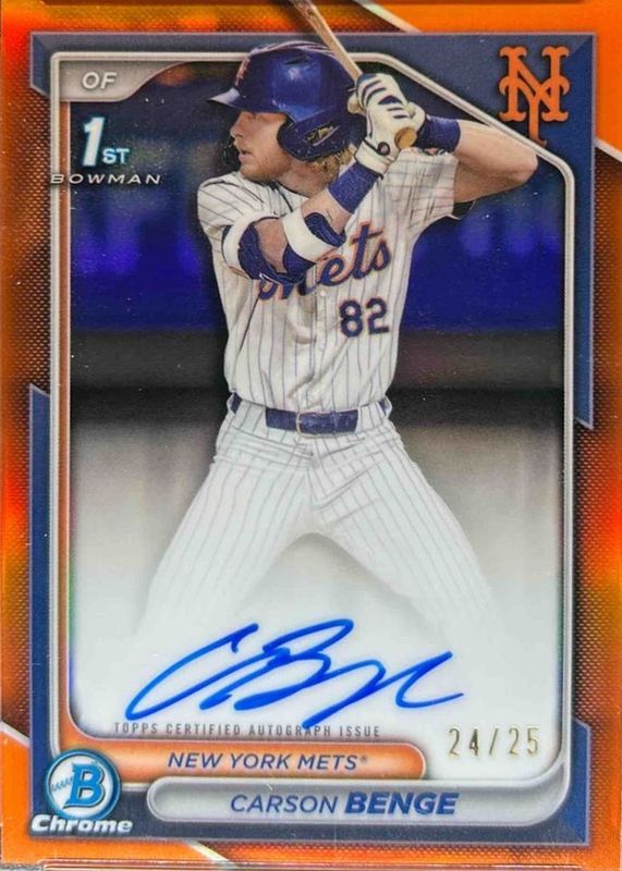The Carson Benge 2024 Bowman Draft #CPA-CBG Chrome Prospect Auto - Orange Refractor /25 (1st) card in Raw condition has not changed in price in the last 30 days and was last sold for $1,813.00 .