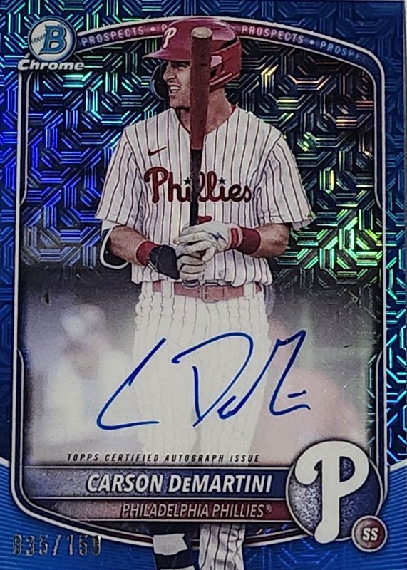 Best Prices Available For Sale of Carson DeMartini 2025 Bowman Mega Box #BMA-CD Chrome Prospect Auto - Blue Refractor /150