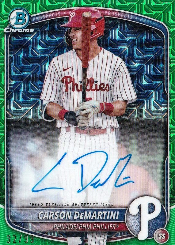 Best Prices Available For Sale of Carson DeMartini 2025 Bowman Mega Box #BMA-CD Chrome Prospect Auto - Green Refractor /99