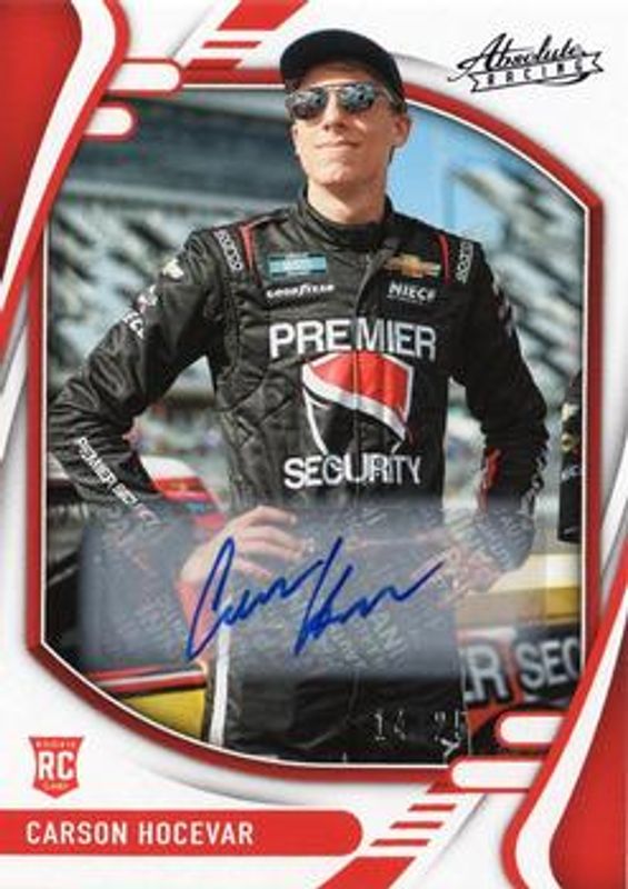 The Carson Hocevar 2022 Chronicles NASCAR #19 Absolute Autographs Purple /10 Rookie card is 1 of 23 Carson Hocevar's card variations in the 2022 Chronicles NASCAR set being tracked by Sports Card Investor, including Absolute, Absolute Autographs, Clearly Donruss, Spectra, and Absolute Blue /199.