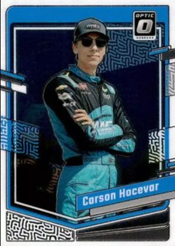 The Carson Hocevar 2024 Donruss NASCAR #6 Optic card is 1 of 101 Carson Hocevar's card variations in the 2024 Donruss NASCAR set being tracked by Sports Card Investor, including #182 Base, #6 Base, #105 Base, #105 Optic, and #182 Optic.
