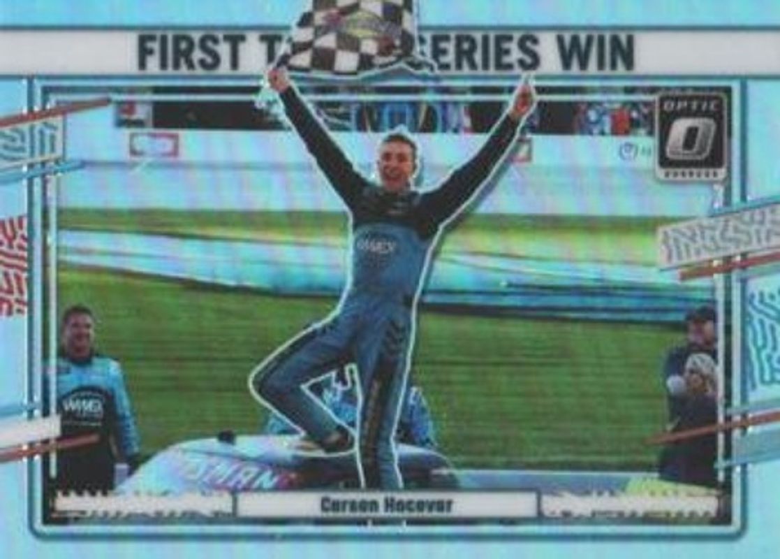 The Carson Hocevar 2024 Donruss NASCAR #182 Optic Holo card is 1 of 101 Carson Hocevar's card variations in the 2024 Donruss NASCAR set being tracked by Sports Card Investor, including #182 Base, #6 Base, #105 Base, #6 Optic, and #105 Optic.