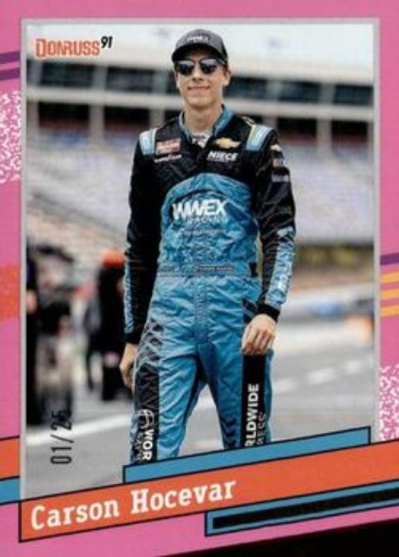 The Carson Hocevar 2024 Donruss NASCAR #105 Pink /25 card is 1 of 101 Carson Hocevar's card variations in the 2024 Donruss NASCAR set being tracked by Sports Card Investor, including #182 Base, #6 Base, #105 Base, #6 Optic, and #105 Optic.
