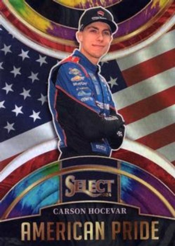 The Carson Hocevar 2024 Select NASCAR #26 American Pride Tie-Dye /25 card is 1 of 78 Carson Hocevar's card variations in the 2024 Select NASCAR set being tracked by Sports Card Investor, including #136 Base, #36 Base, #236 Base, #136 Base Orange Flash, and #36 Base Orange Flash.