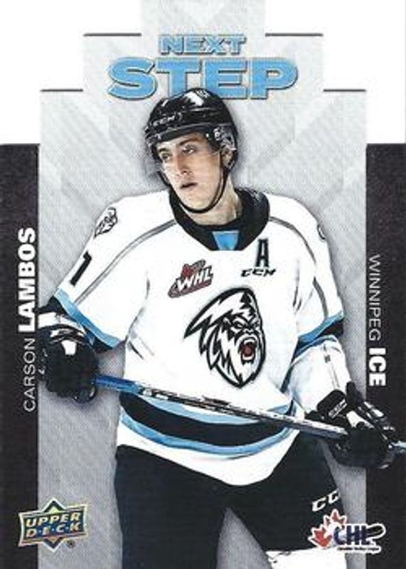 The Carson Lambos 2021 Upper Deck CHL #NS-9 Next Step card is 1 of 15 Carson Lambos' card variations in the 2021 Upper Deck CHL set being tracked by Sports Card Investor, including Base, Clear Cut, Exclusives /100, High Gloss /10, and Printing Plates Black /1.