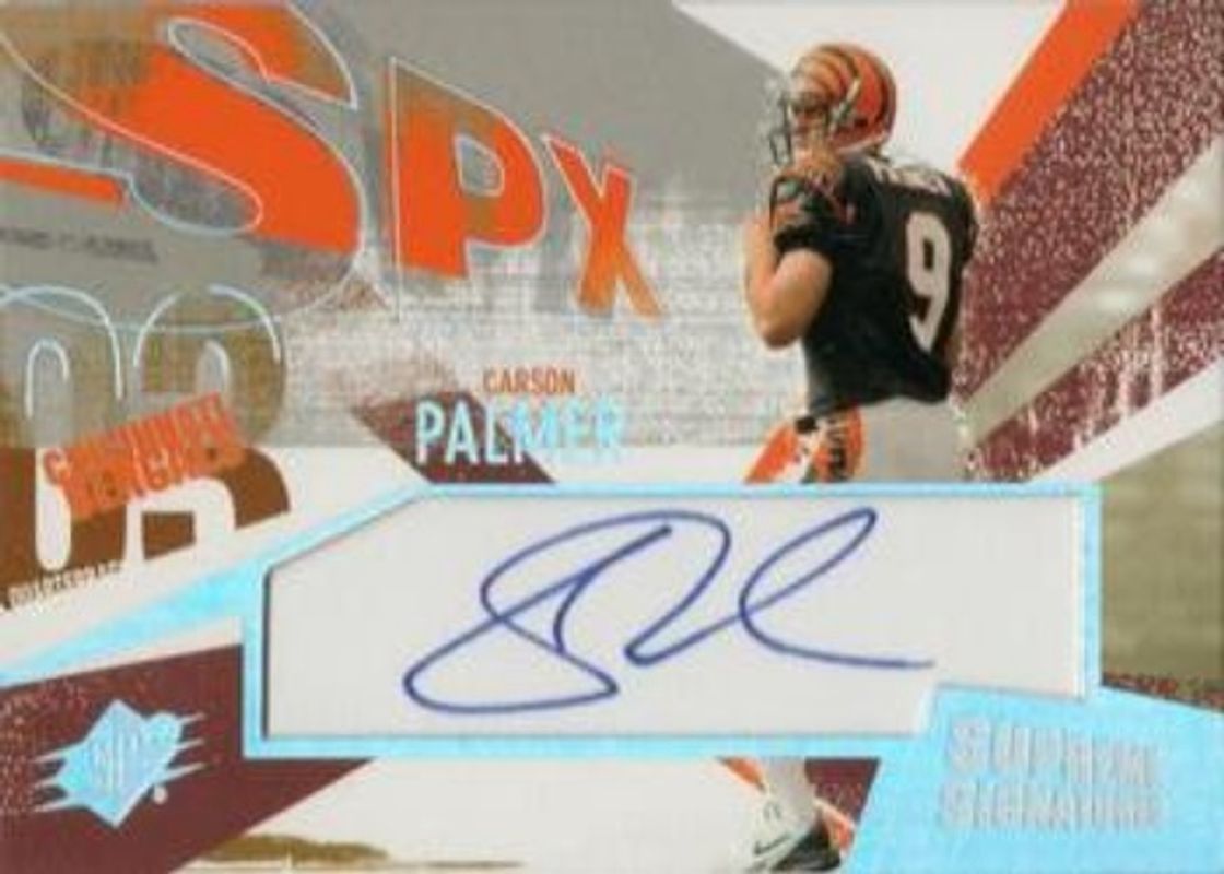 The Carson Palmer 2003 SPx #SS-CP Supreme Signatures Rookie card is 1 of 8 Carson Palmer's card variations in the 2003 SPx set being tracked by Sports Card Investor, including Base /1100, Spectrum /25, Winning Materials /350, Supreme Signatures - Spectrum /50, and Winning Materials Team Logos - Spectrum /50.