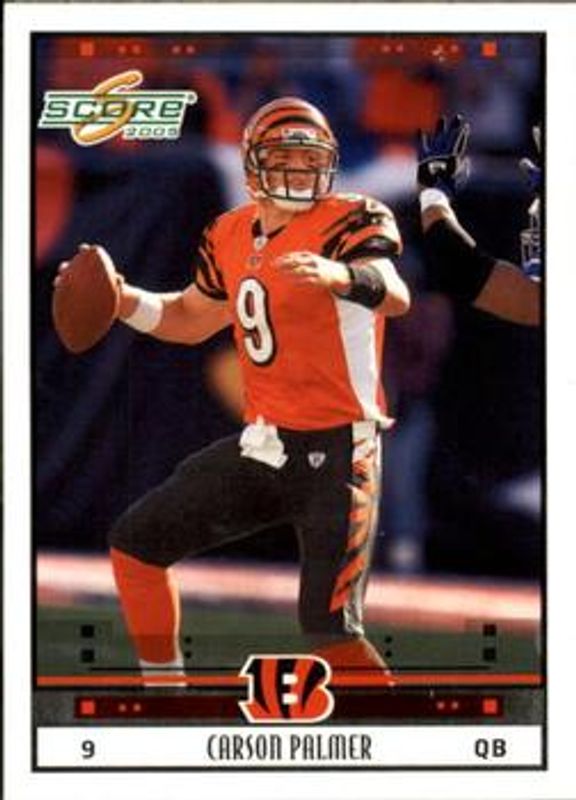 The Carson Palmer 2005 Score #55 Base card is 1 of 6 Carson Palmer's card variations in the 2005 Score set being tracked by Sports Card Investor, including Glossy, Scorecard /599, Adrenaline /399, Revolution /199, and Final Score /17.