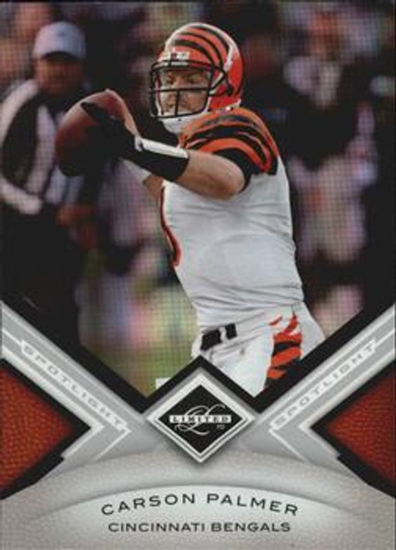 The Carson Palmer 2010 Limited #19 Silver Spotlight /25 card is 1 of 13 Carson Palmer's card variations in the 2010 Limited set being tracked by Sports Card Investor, including Base /199, Gold Spotlight /25, Platinum Spotlight /1, Threads /199, and Team Trademarks Materials /100.