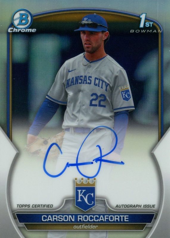 The Carson Roccaforte 2023 Bowman Draft #CDA-CR Chrome Prospect Auto - Refractor /499 (1st) card in Raw condition has not changed in price in the last 30 days and was last sold for $24.99 .