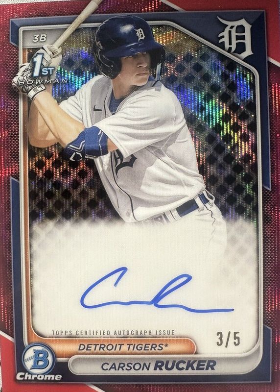 The Carson Rucker 2024 Bowman #CPA-CR Chrome Prospect Auto - Red Wave Refractor /5 (1st) card in Raw condition has not changed in price in the last 30 days and was last sold for $350.00 .