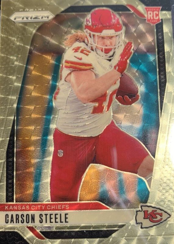 The Carson Steele 2024 Prizm #377 Gold Vinyl /5 Rookie card in Raw condition has not changed in price in the last 30 days and was last sold for $175.00 .