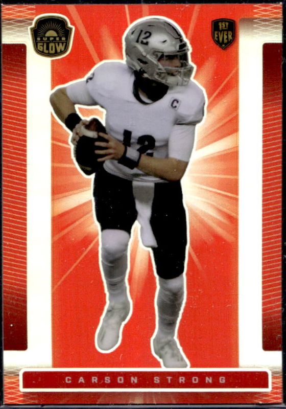 The Carson Strong 2021 Super Glow #18 Red Glow card is 1 of 147 Carson Strong's card variations in the 2021 Super Glow set being tracked by Sports Card Investor, including Base, Blue Foil, Blue Glow, Gold Foil, and Gold Glow.