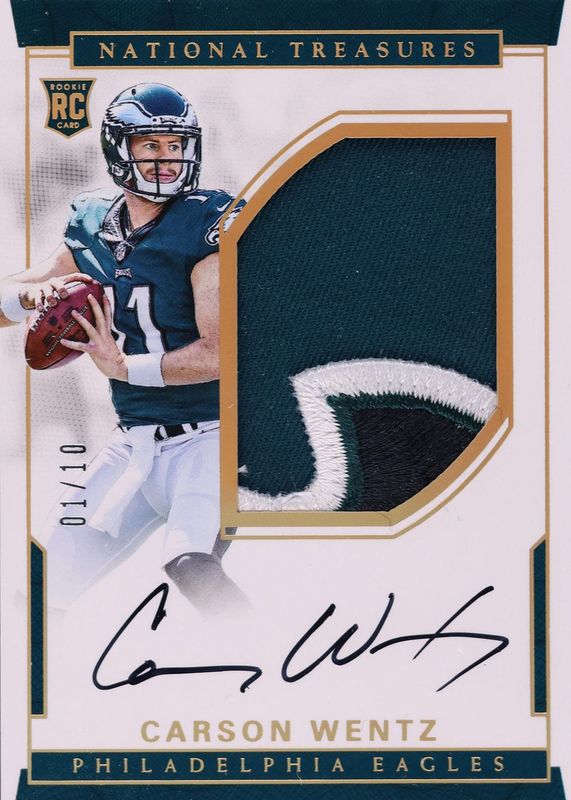This card is 1 of 11 Carson Wentz's card variations in the 2016 National Treasures set being tracked by Sports Card Investor, including Rookie Patch Auto /99, Rookie Patch Auto - Numbers Green (/11), Rookie Patch Auto - Holo Silver /25, Rookie Patch Auto - 10th Anniversary /10, and Rookie Patch Auto - 10th Anniversary Platinum /10.