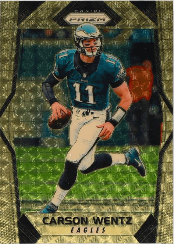 This card is 1 of 5 Carson Wentz's card variations in the 2017 Prizm set being tracked by Sports Card Investor, including White Sparkle /(SSP), Gold /10, FOTL Bronze Stars /(Print Run: 6), and Black Finite /1.