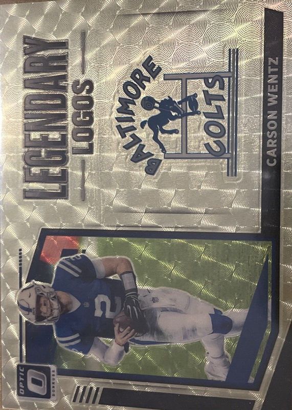 This card is 1 of 6 Carson Wentz's card variations in the 2021 Optic set being tracked by Sports Card Investor, including Legendary Logos, Legendary Logos - Black Pandora /25, Legendary Logos - Purple Stars /25, Legendary Logos - Ice /15, and Legendary Logos - Gold /10.