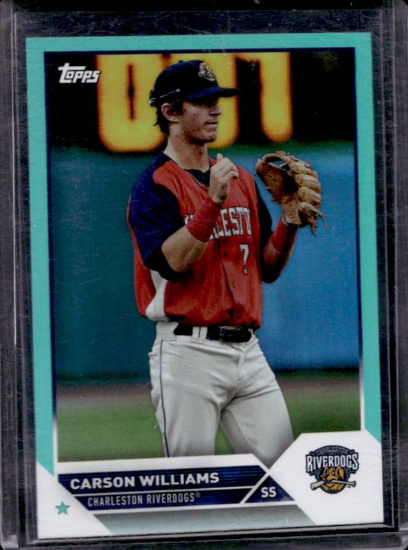 The Carson Williams 2023 Topps Pro Debut #PD-3 Aqua /75 card is 1 of 28 Carson Williams' card variations in the 2023 Topps Pro Debut set being tracked by Sports Card Investor, including Base, Fuchsia /199, Sparkle /175, Blue /150, and Green /99.