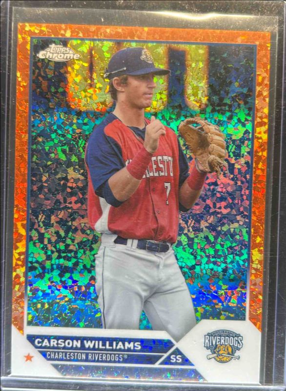 The Carson Williams 2023 Topps Pro Debut #PDC-3 Base Chrome - Orange Mini Diamond Refractor /25 card is 1 of 28 Carson Williams' card variations in the 2023 Topps Pro Debut set being tracked by Sports Card Investor, including Base, Fuchsia /199, Sparkle /175, Blue /150, and Green /99.