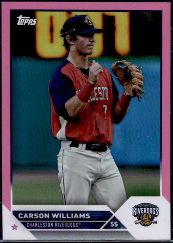 The Carson Williams 2023 Topps Pro Debut #PD-3 Fuchsia /199 card is 1 of 28 Carson Williams' card variations in the 2023 Topps Pro Debut set being tracked by Sports Card Investor, including Base, Sparkle /175, Blue /150, Green /99, and Aqua /75.