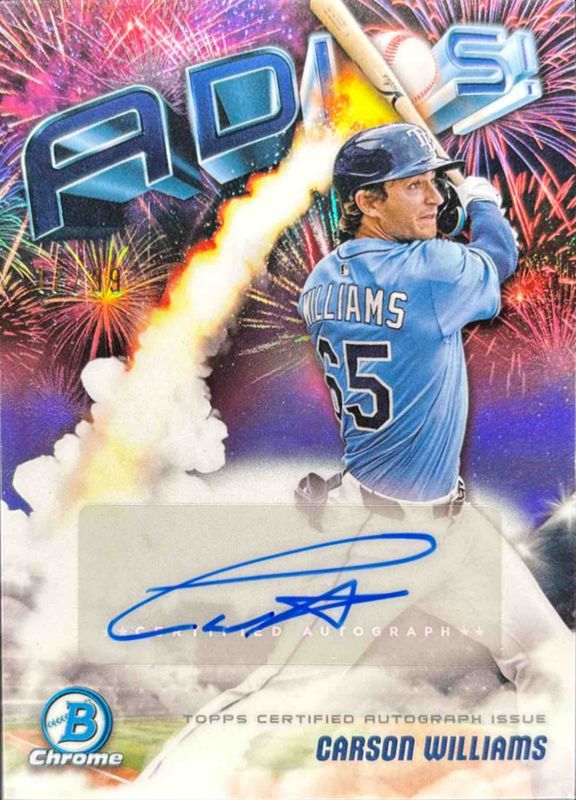The Carson Williams 2025 Bowman Chrome #AAV-CW ADIOS! Autographs /99 card is 1 of 91 Carson Williams' card variations in the 2025 Bowman Chrome set being tracked by Sports Card Investor, including ADIOS!, Chrome Autographs Relic, GPK, GPK Autographs, and Max Volume.