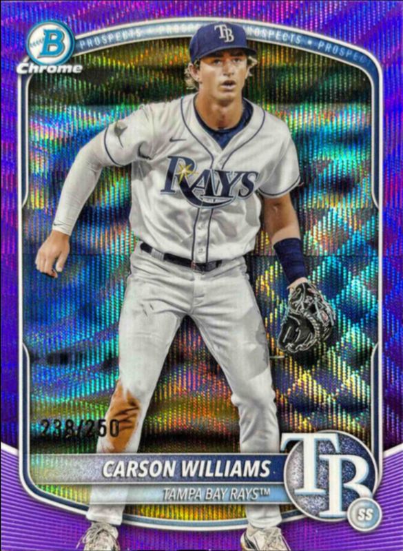 The Carson Williams 2025 Bowman Chrome #BCP-234 Prospects - Orange Wave Refractor /25 card is 1 of 91 Carson Williams' card variations in the 2025 Bowman Chrome set being tracked by Sports Card Investor, including ADIOS!, Chrome Autographs Relic, GPK, GPK Autographs, and Max Volume.