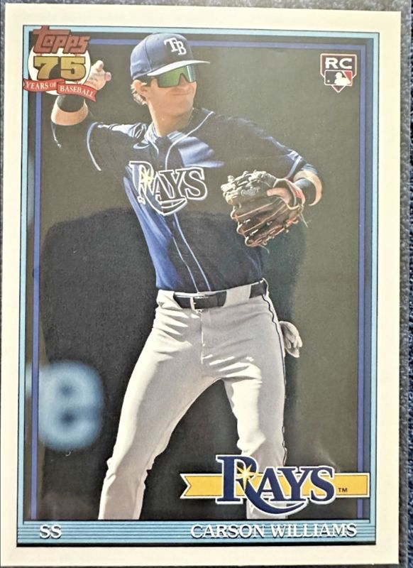 The Carson Williams 2026 Topps #T91-38 1991 Topps Rookie card is 1 of 134 Carson Williams' card variations in the 2026 Topps set being tracked by Sports Card Investor, including Base, 1952 Rookie Variation, Aqua Holo Foil, Aqua Rainbow Foil, and Diamante Foil.