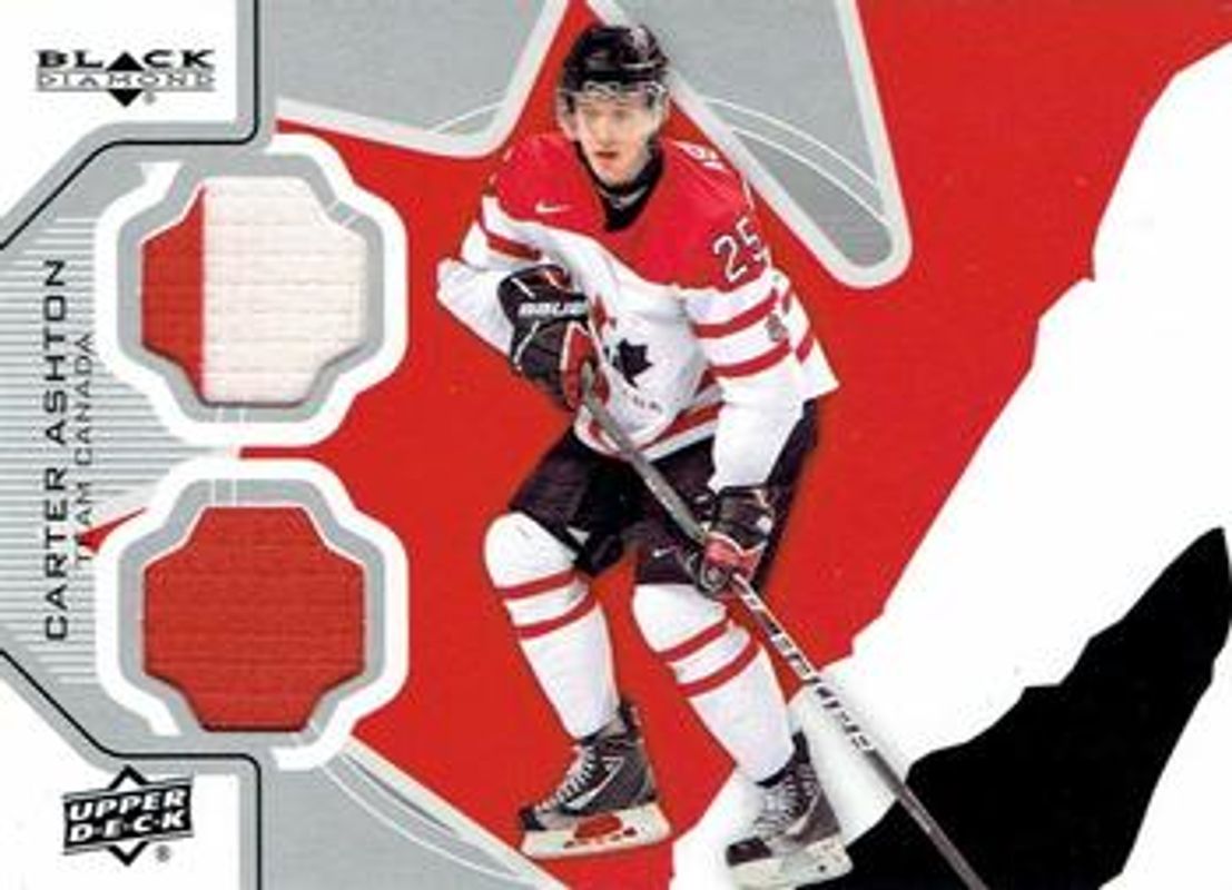 The Carter Ashton 2012 Upper Deck Black Diamond #TC1-CA Double Diamond Jerseys Rookie card is 1 of 9 Carter Ashton's card variations in the 2012 Upper Deck Black Diamond set being tracked by Sports Card Investor, including Base, Ruby /100, Emerald /10, Sapphire /1, and Gemography.