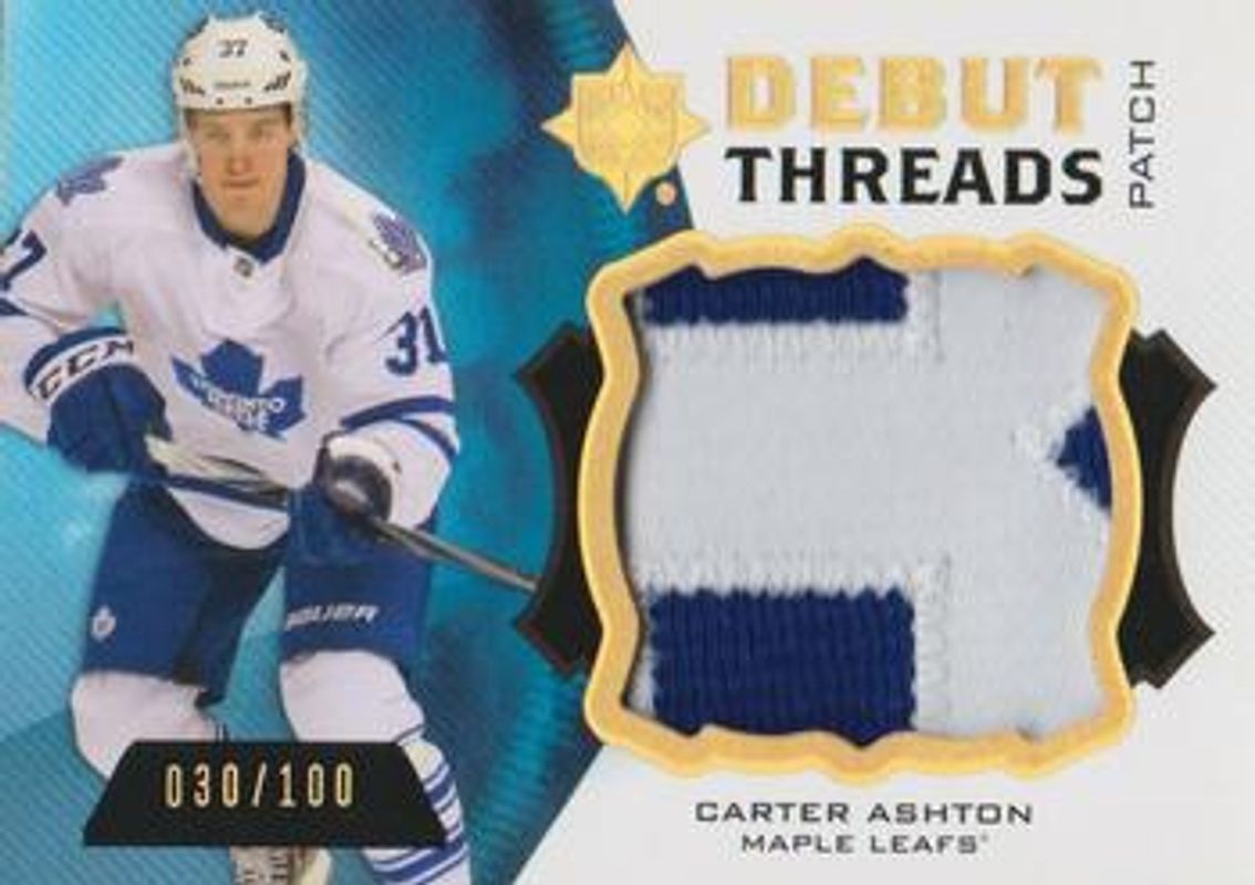 The Carter Ashton 2012 Upper Deck The Cup #UDTP-CA 2012 Upper Deck Ultimate Collection: Debut Threads Patches /100 Rookie card is 1 of 58 Carter Ashton's card variations in the 2012 Upper Deck The Cup set being tracked by Sports Card Investor, including Base /249, Gold /25, Gold Rainbow /10, Black /1, and Black Laundry Tags /1.