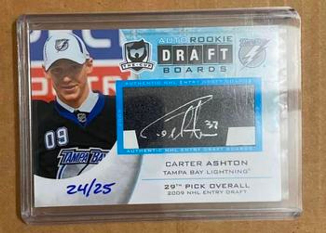 The Carter Ashton 2012 Upper Deck The Cup #DB-CA Auto Draft Boards /25 Rookie card is 1 of 58 Carter Ashton's card variations in the 2012 Upper Deck The Cup set being tracked by Sports Card Investor, including Base /249, Gold /25, Gold Rainbow /10, Black /1, and Black Laundry Tags /1.