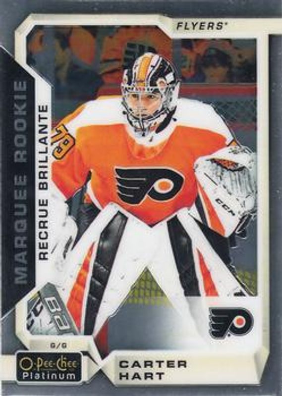 The Carter Hart 2018 O-Pee-Chee Platinum #199 Base Rookie card is 1 of 22 Carter Hart's card variations in the 2018 O-Pee-Chee Platinum set being tracked by Sports Card Investor, including Rainbow, Violet Pixels, Red Prism /199, Arctic Freeze /79, and Seismic Gold /50.