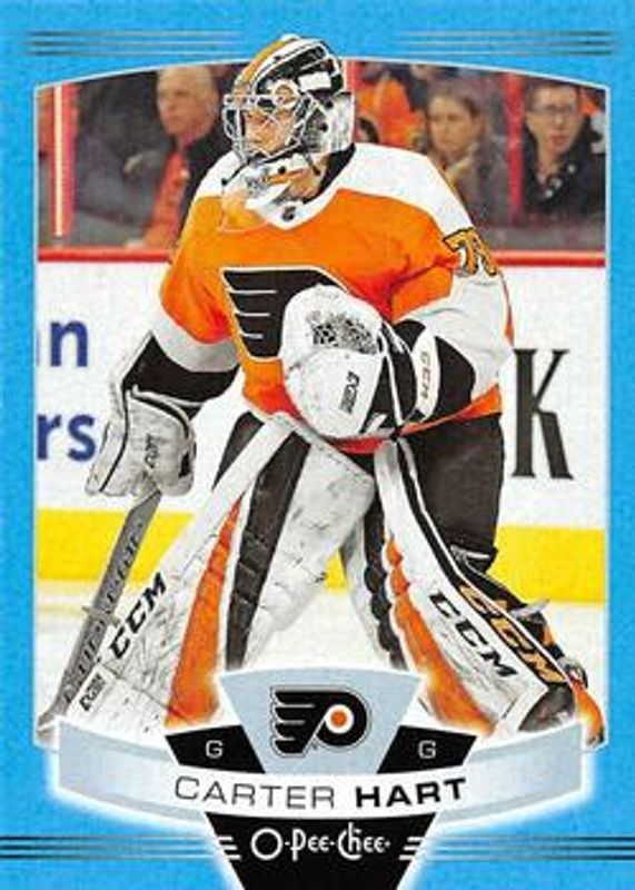The Carter Hart 2019 O-Pee-Chee #64 Blue Border card is 1 of 9 Carter Hart's card variations in the 2019 O-Pee-Chee set being tracked by Sports Card Investor, including Base, Gold Border, Red Border, Red Border Blank Back, and Retro.