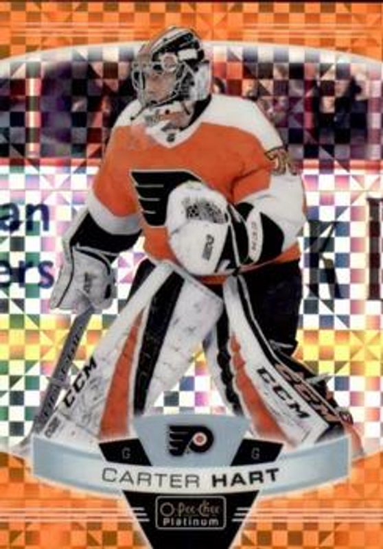 The Carter Hart 2019 O-Pee-Chee Platinum #110 Orange Checkers /25 card is 1 of 12 Carter Hart's card variations in the 2019 O-Pee-Chee Platinum set being tracked by Sports Card Investor, including Base, Matte Pink, Rainbow, Sunset, and Violet Pixels /399.