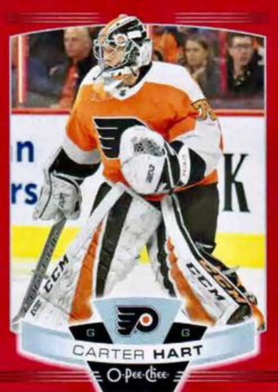 The Carter Hart 2019 O-Pee-Chee #64 Red Border Blank Back card is 1 of 9 Carter Hart's card variations in the 2019 O-Pee-Chee set being tracked by Sports Card Investor, including Base, Blue Border, Gold Border, Red Border, and Retro.
