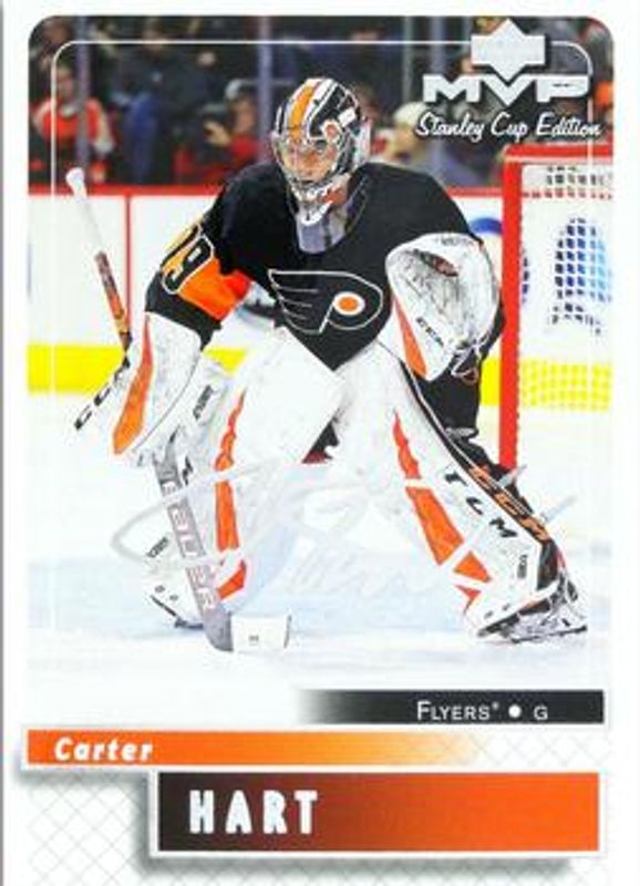 The Carter Hart 2019 Upper Deck MVP #87 Stanley Cup Edition 20th Anniversary Silver Script card is 1 of 18 Carter Hart's card variations in the 2019 Upper Deck MVP set being tracked by Sports Card Investor, including Base, Blue, Gold Script, Puzzle Backs, and Silver Script.