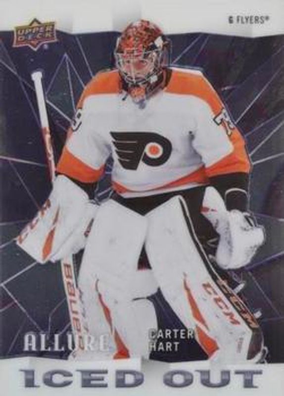 The Carter Hart 2020 Upper Deck Allure #IO-14 Iced Out card is 1 of 40 Carter Hart's card variations in the 2020 Upper Deck Allure set being tracked by Sports Card Investor, including Base, 2005 Shield, Black Rainbow, Blue China, and Leopard.
