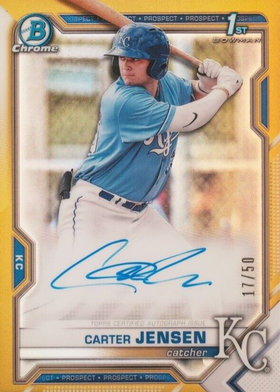 Best Prices Available For Sale of Carter Jensen 2021 Bowman Draft #CDA-CJ Chrome DP Auto - Gold Refractor /50 (1st)