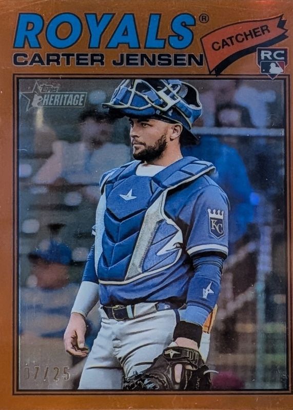 The Carter Jensen 2026 Topps Heritage #199 Chrome - Orange Refractor /25 Rookie card in Raw condition has moved up $150 (+150%) in the last 30 days and was last sold for $250.00 .