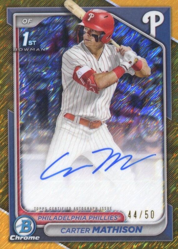 2024 Bowman Draft Carter Mathison 1st Chrome Auto Gold Shimmer /50 Phillies
