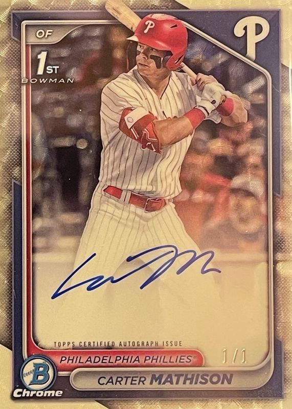 The Carter Mathison 2024 Bowman Draft #CPA-CMA Chrome DP Auto - Superfractor /1 (1st) card in Raw condition has not changed in price in the last 30 days and was last sold for $1,305.00 .