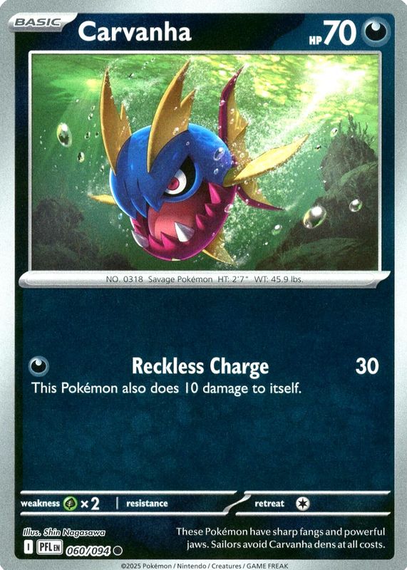 Carvanha 2025 Mega Evolution: Phantasmal Flames #60/94 Reverse Holo RAW TCG (LIGHTLY PLAYED) Price Guide