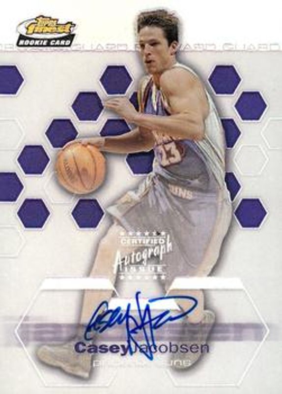 The Casey Jacobsen 2002 Topps Finest #159 Refractor /250 Rookie card is 1 of 3 Casey Jacobsen's card variations in the 2002 Topps Finest set being tracked by Sports Card Investor, including Base, and Gold Refractor /25.