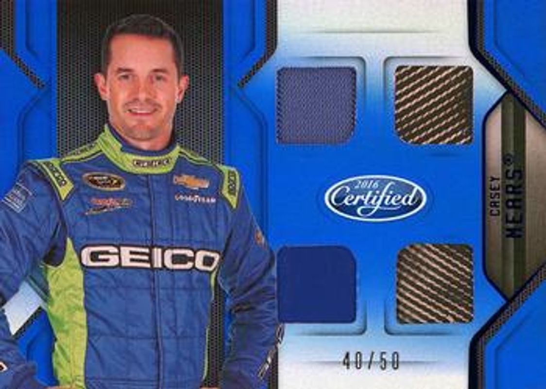 The Casey Mears 2016 Certified NASCAR #CM-CM Complete Materials - Mirror Blue /50 card is 1 of 45 Casey Mears' card variations in the 2016 Certified NASCAR set being tracked by Sports Card Investor, including Base /99, Mirror Red /25, Mirror Blue /20, Mirror Gold /15, and Mirror Orange /15.