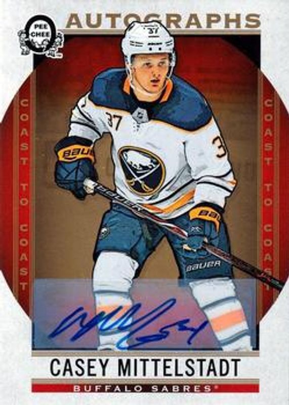 Casey Mittelstadt's Hockey cards are available in at least 62 sets. Casey Mittelstadt's biggest 7-day price movers are 2024 Upper Deck Stature #80 2022-23 Update Design Photo Variant Auto - Memorabilia Purple, 2024 Upper Deck Stature #80 2022-23 Update Design Photo Variant Auto - Memorabilia Red, and 2024 Upper Deck Stature #80 2022-23 Update Photo Variant - Auto.