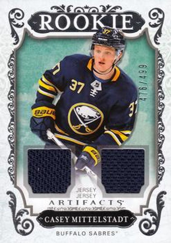 The Casey Mittelstadt 2018 Upper Deck Artifacts #176 Material Jersey Silver /125 Rookie card is 1 of 16 Casey Mittelstadt's card variations in the 2018 Upper Deck Artifacts set being tracked by Sports Card Investor, including Base /799, Ruby /349, Emerald /99, Aqua /45, and Purple /20.