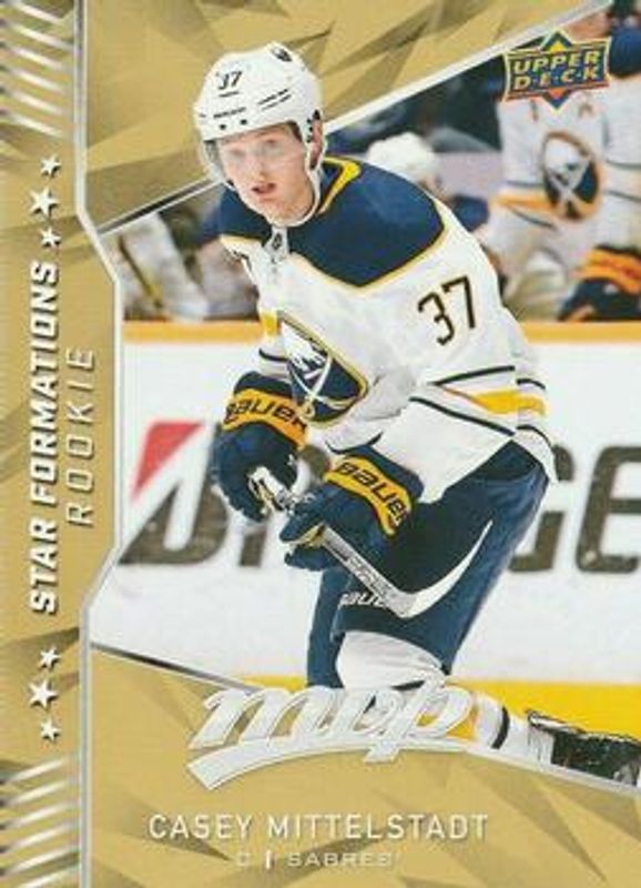The Casey Mittelstadt 2018 Upper Deck MVP #SF-5 Star Formations Rookie card is 1 of 20 Casey Mittelstadt's card variations in the 2018 Upper Deck MVP set being tracked by Sports Card Investor, including Base, Factory Set Blue, Green Script, Silver Script, and Gold Script /150.