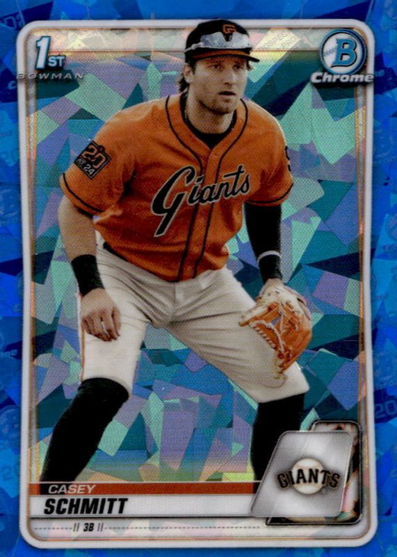 This card is 1 of 9 Casey Schmitt's card variations in the 2020 Bowman Draft Sapphire Edition set being tracked by Sports Card Investor, including Chrome - Yellow /99 (1st), Chrome - Green /50 (1st), Chrome - Orange /25 (1st), Chrome - Aqua /20 (1st), and Chrome - Gold /15 (1st).