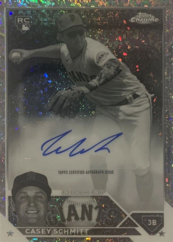 The Casey Schmitt 2023 Topps Chrome Update #AC-CSC Autographs - Black & White Mini-Diamond Refractor Rookie card in Raw condition has not changed in price in the last 30 days and was last sold for $22.26 .