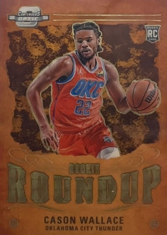 The Cason Wallace 2023 Contenders Optic #5 Rookie Roundup - Gold Vinyl /1 card in Raw condition has not changed in price in the last 30 days and was last sold for $167.50 .