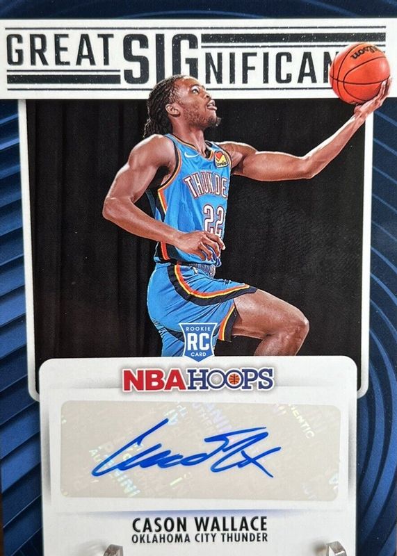 The Cason Wallace 2023 Hoops #GS-WLE Great SIGnificance Rookie card in Raw condition has not changed in price in the last 30 days and was last sold for $15.00 .