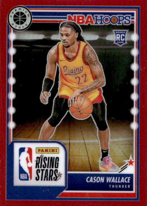 The Cason Wallace 2023 Hoops Premium Stock #281 Rising Stars - Red /275 Rookie card in Raw condition has not changed in price in the last 30 days and was last sold for $2.00 .